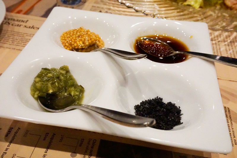 粒マスタード・和風おろし醤油・ホースラディッシュ・竹炭塩です。