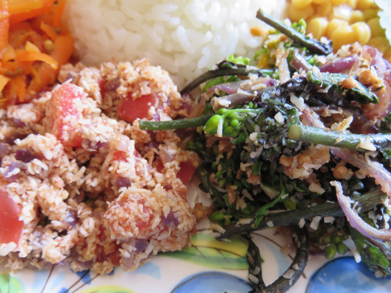 スリランカ風ココナッツのしっとりふりかけと紅菜苔の炒めもの。