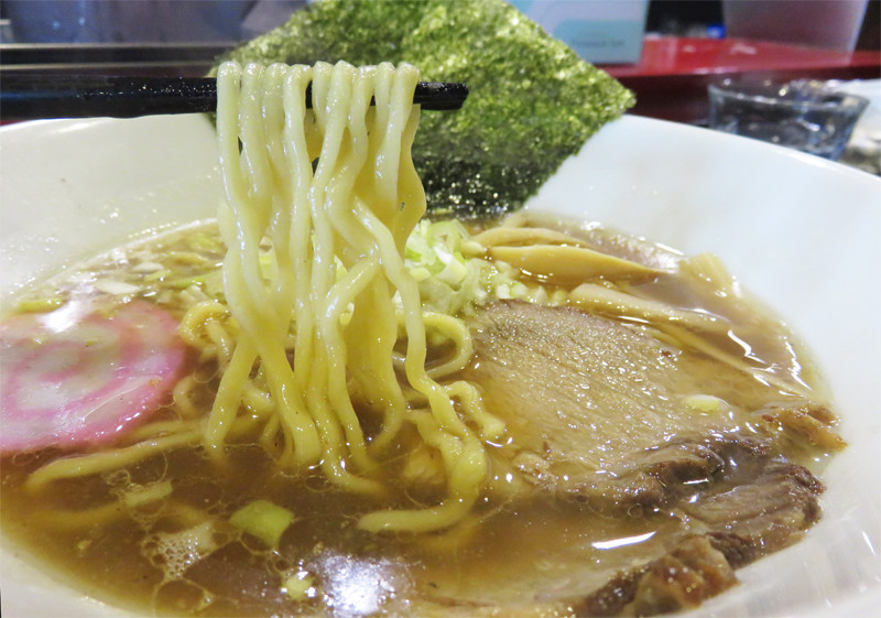 節系醤油スープの適度な強さに中太麺がマッチします。