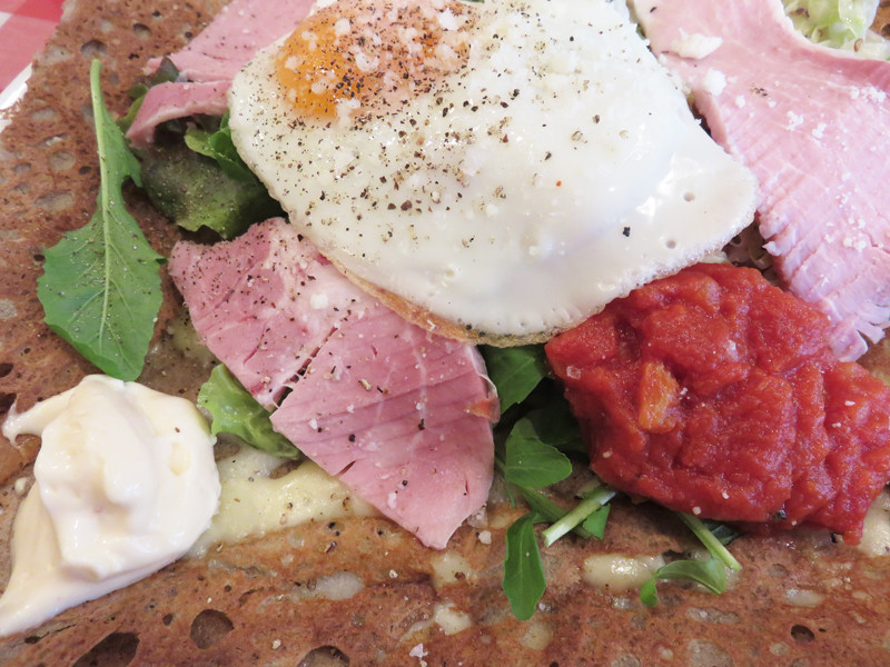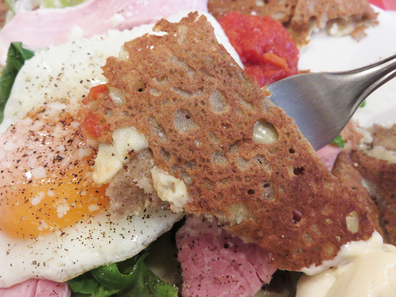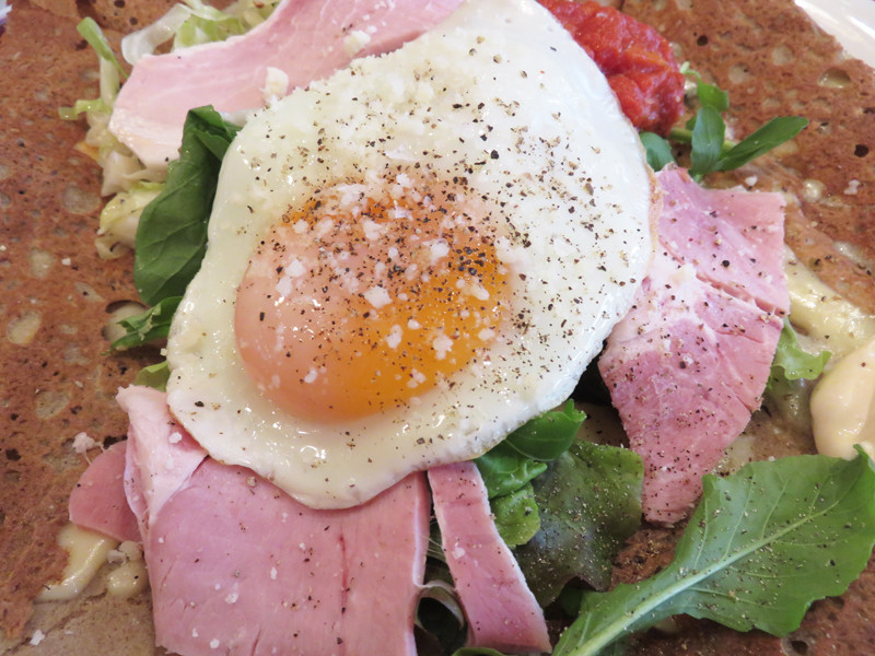 ガレット・コンプレットのように生地と一緒に焼かず、ハムも目玉焼きも後のせです。