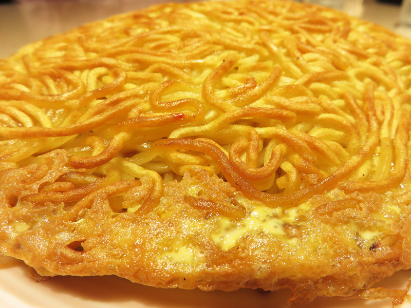 麺は両面焼き付けてあるそうで、円のぐるりは溶き玉子を流し込んで固めているようです。