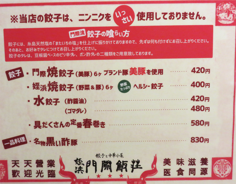 ※姉妹店に、姪浜 門際飯荘(餃子と中華)・もんぎわ生餃子(お持ち帰り専門店)・餃子ストア(酒場)があります。