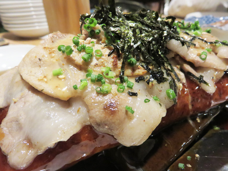 上にはたっぷりのソース、そして表面は美豚のバラ肉焼きスライスで覆ってあります。