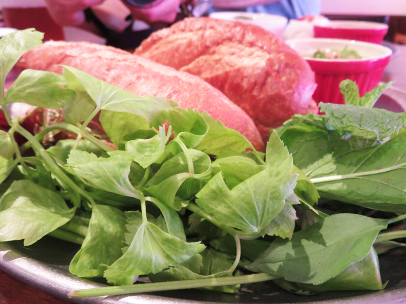 バター、パテを塗り、野菜、ハーブ類、肉などをはさみ、ヌックマム(魚醤)を振り掛ける。