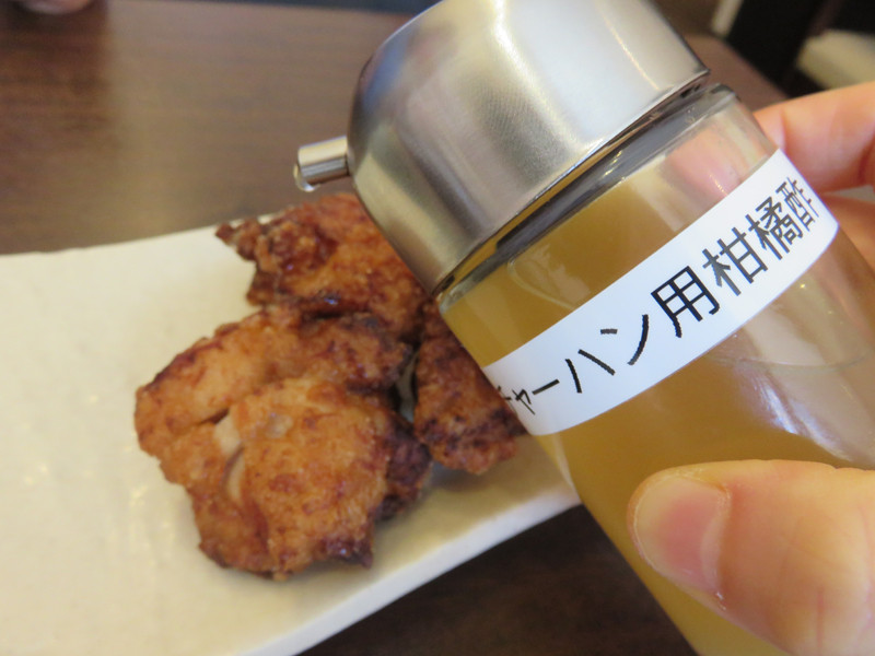 卓上のチャーハン用柑橘酢をレモン代わりに振っても爽やかです。