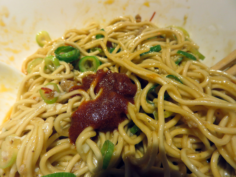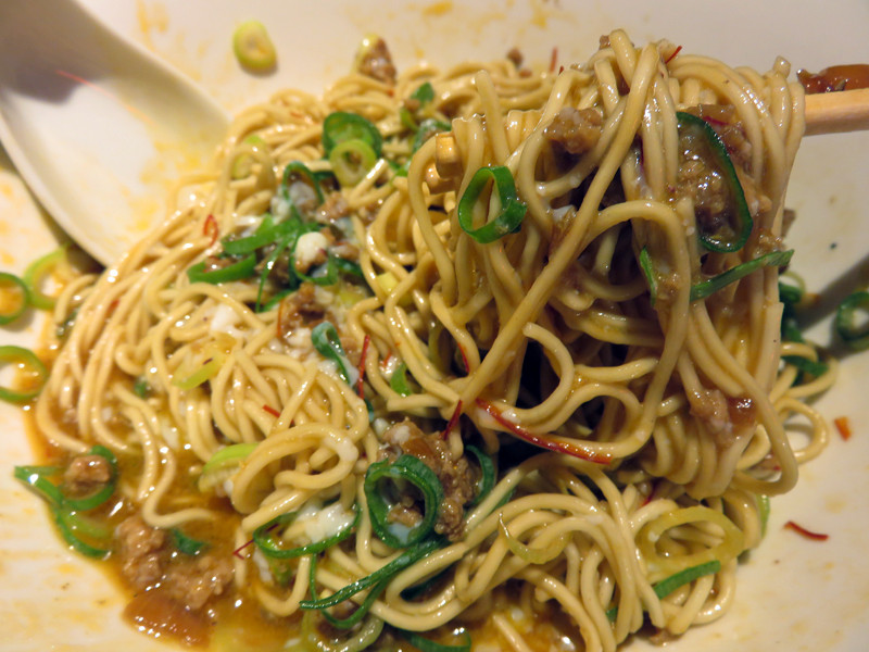 汁なしと謳ってますが、ラー油のようなソースはたっぷりかかっています。