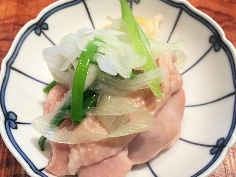 鶏肉の切り身をネギの薄切りのしゃぶしゃぶ仕立てと共に頂きます。