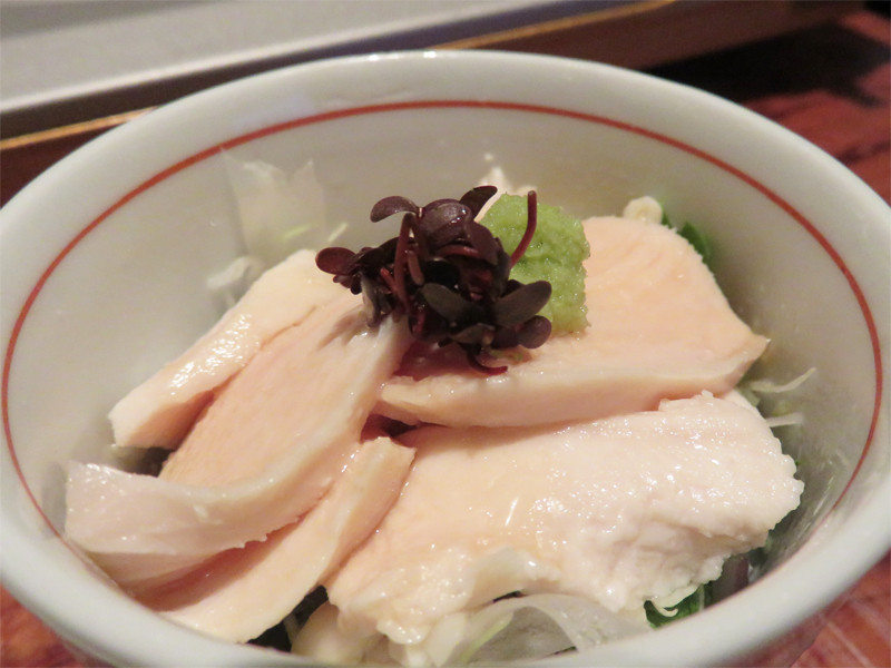 鶏胸肉の鶏ハムみたいな感じで、下にはキャベツの千切りが敷かれてます。