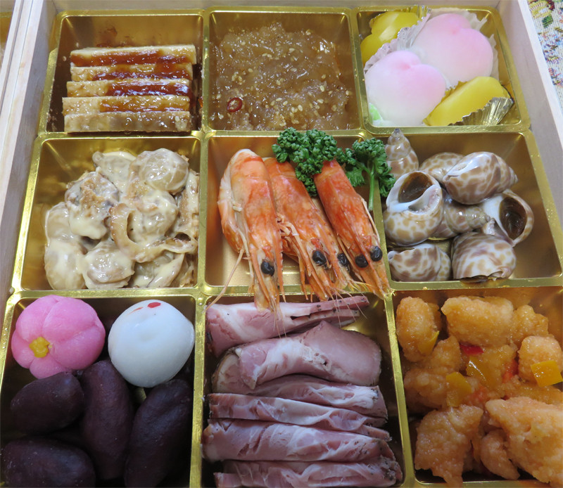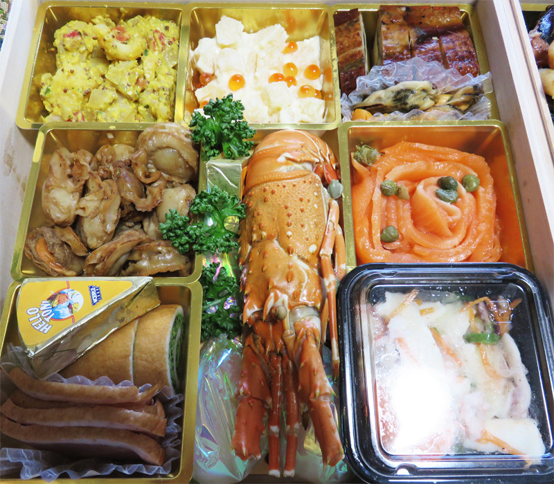 小女子くるみ・蓮根旨煮・手羽甘辛煮・ソフトチーズ・タタキ牛蒡・筍旨煮・鶏団子・伊達巻・切り干しごま和え・カニ甲羅蒸し・りんごのうた・椎茸みそ漬・モズク酢・菊カブ・黒豆