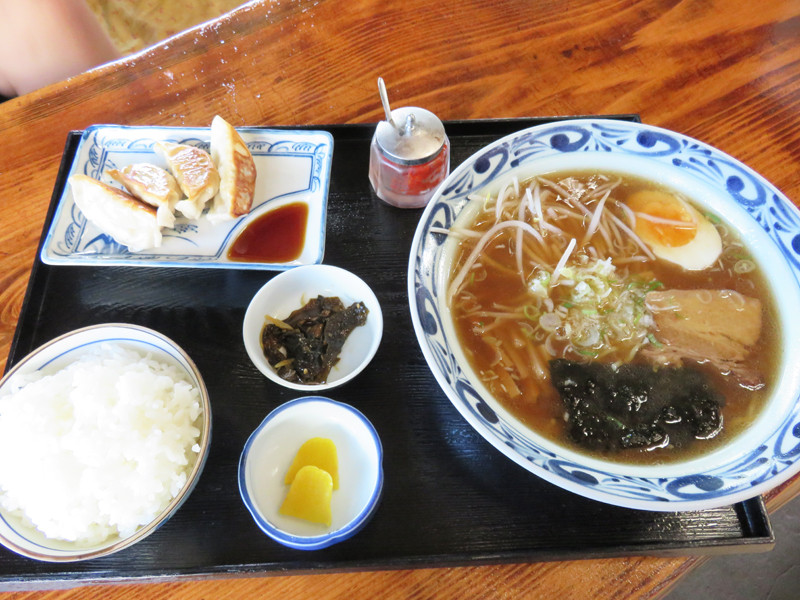 会津らーめん+餃子+ご飯+漬物の構成です。