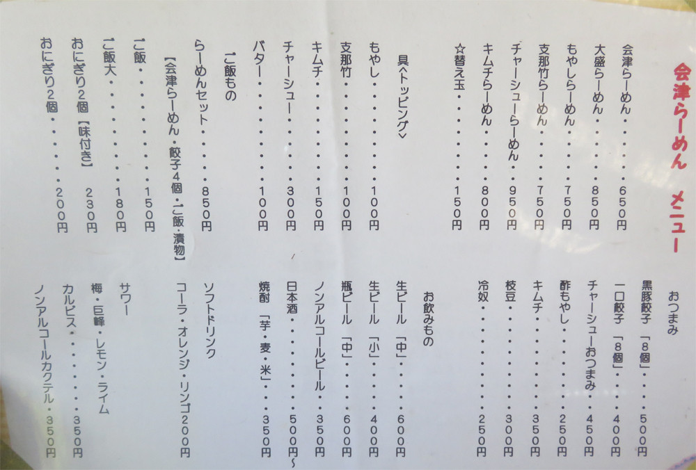 会津ラーメンのメニューです。