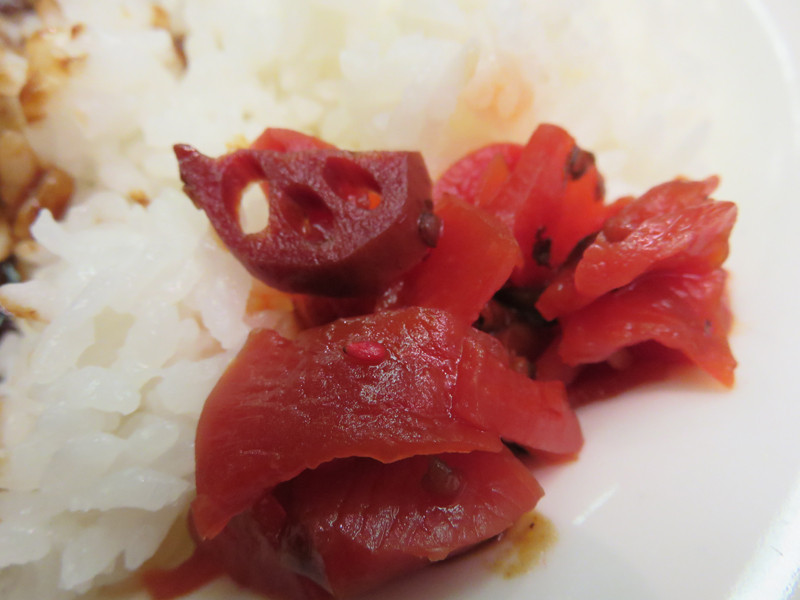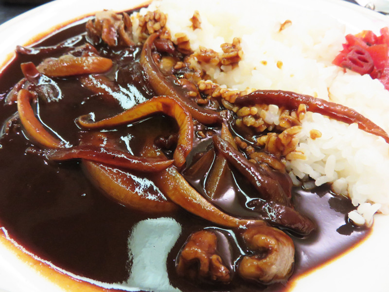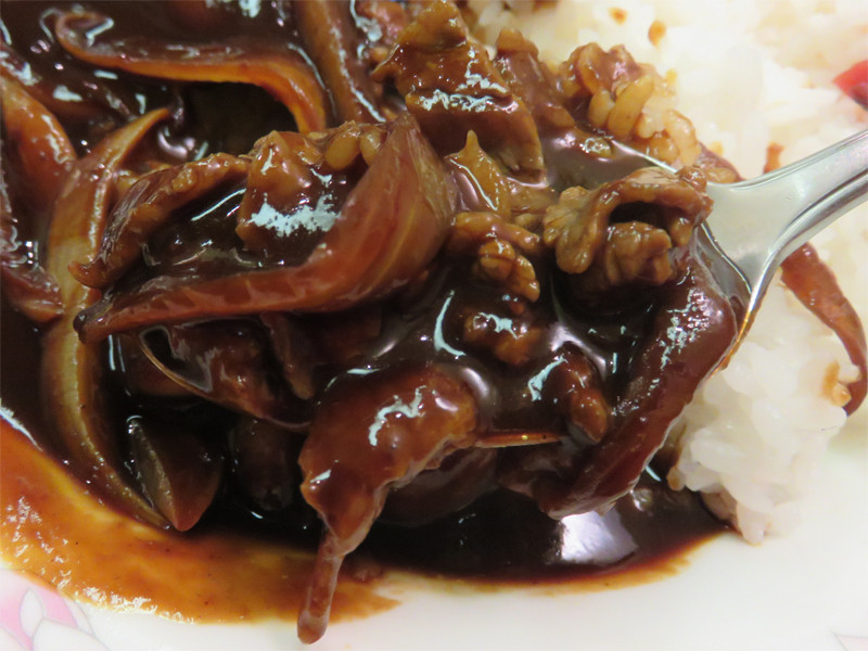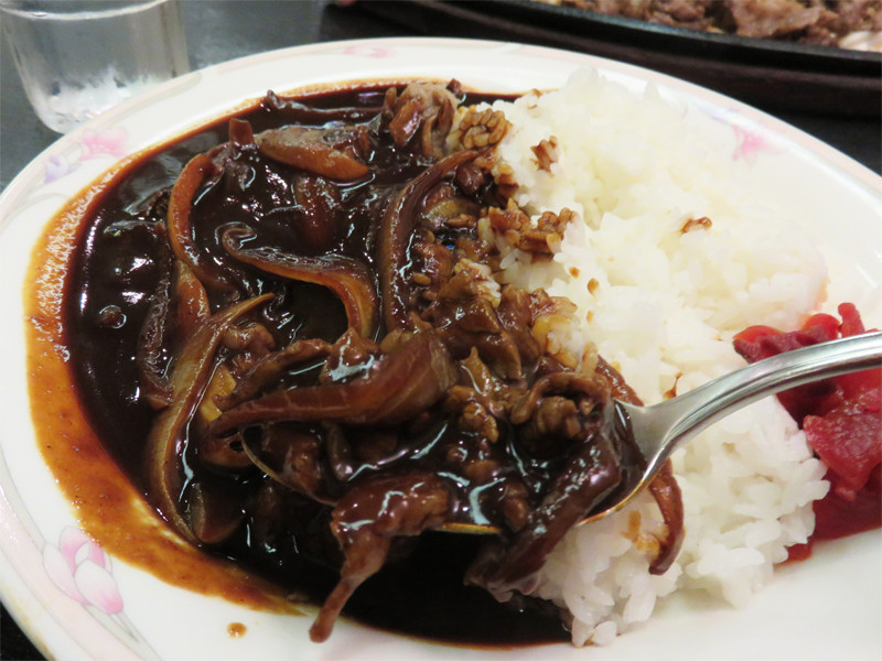 ハヤシライスは赤い色かと思っていましたが、かなりの褐色でした。