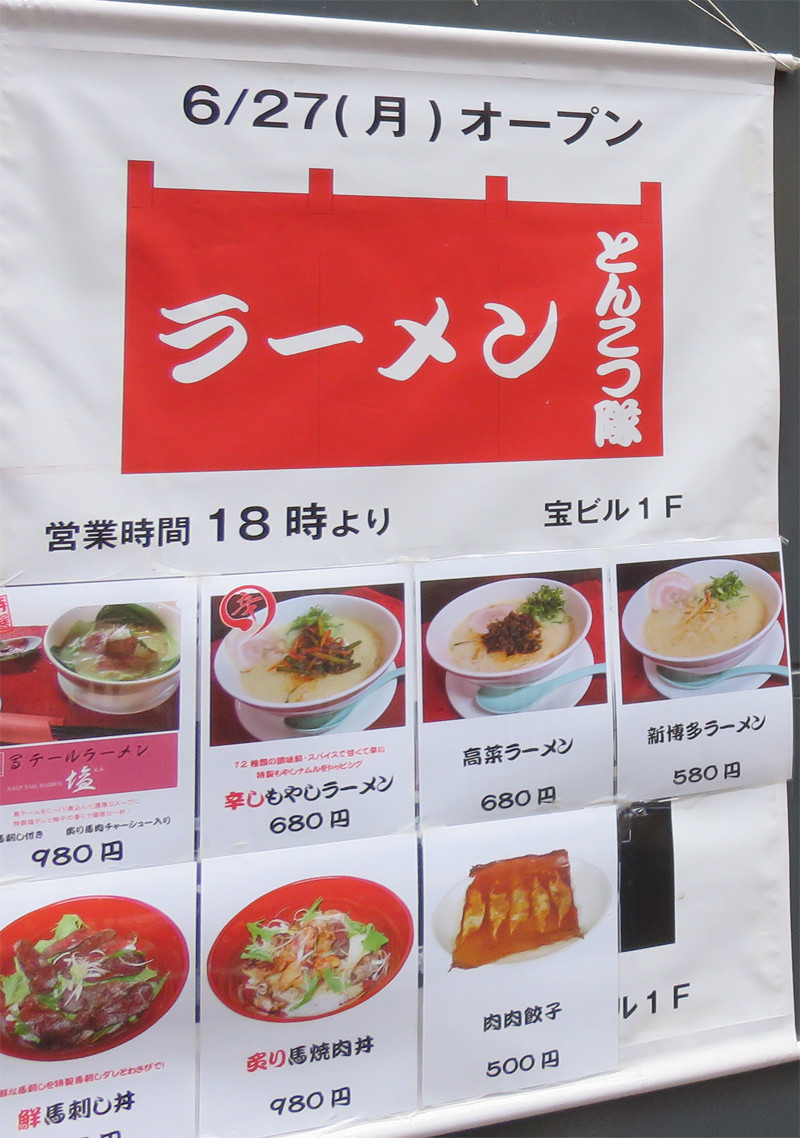 夜営業のみですが、豚骨ラーメンの他に牛テールラーメンや馬刺丼があって面白いですね。
