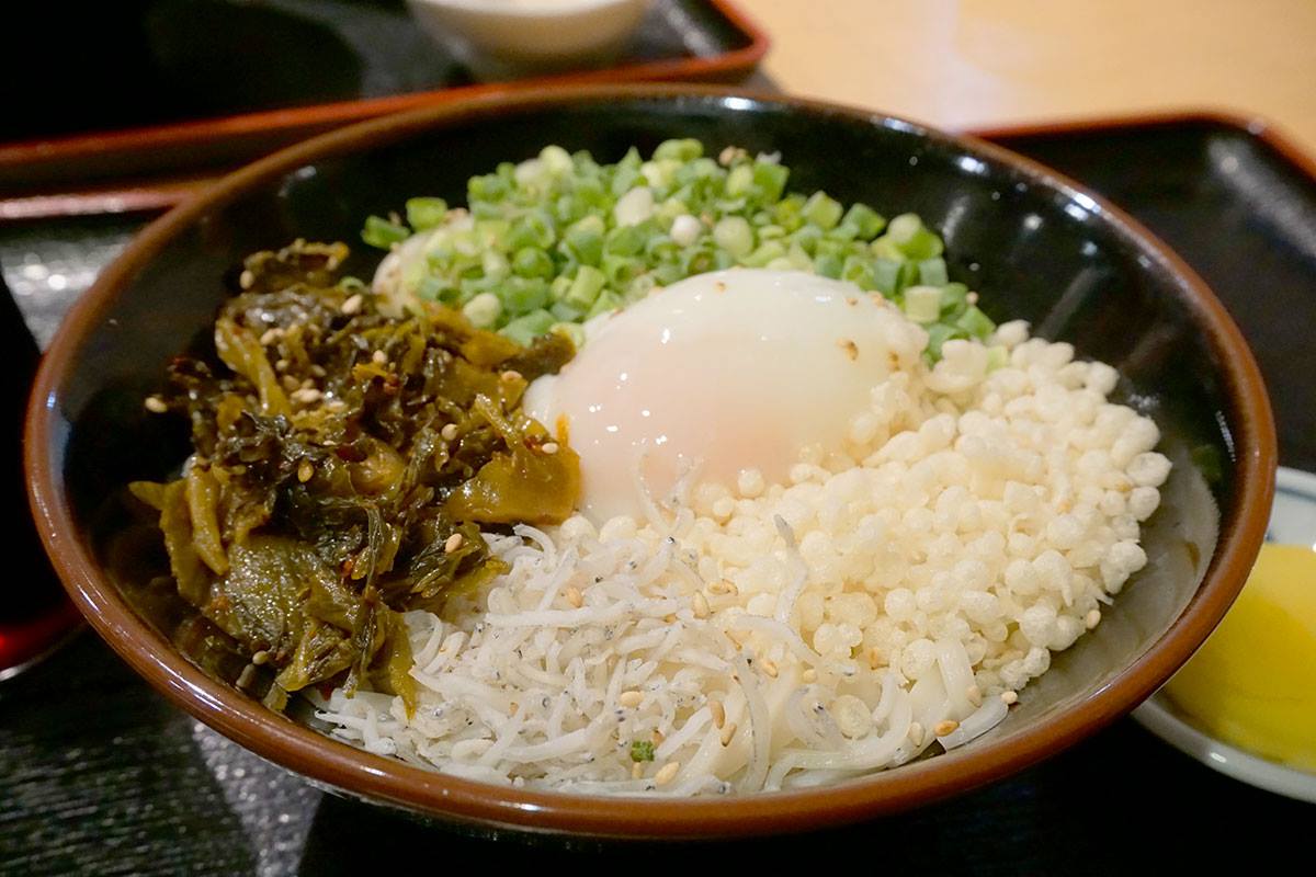 しらす・高菜・揚げ玉・ネギ・温泉卵がトッピングされてます。