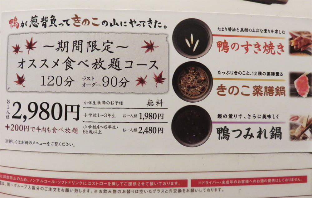 【期間限定】鴨のすきやきコース食べ放題2,980円にしました。