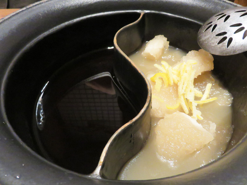 鴨のすきやきコースを頼んだら、鍋が中国の火鍋のように陰陽式になっていて、