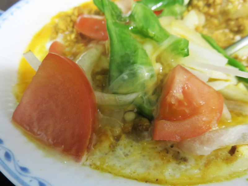 ほうれん草ソース・キーマカレー・溶き卵・野菜の構成です。