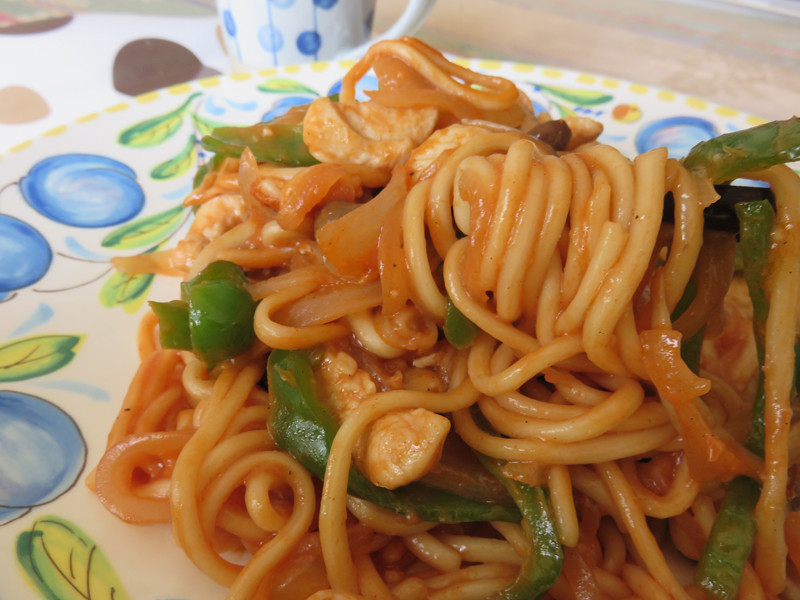 まるで、喫茶店の茹で置きスパゲティ麺で作るナポリタンのようです。