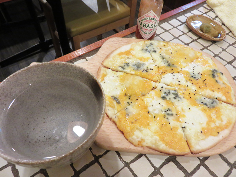 シメは、芋焼酎と味わうピッツァのクワトロ・フォルマッジォ。