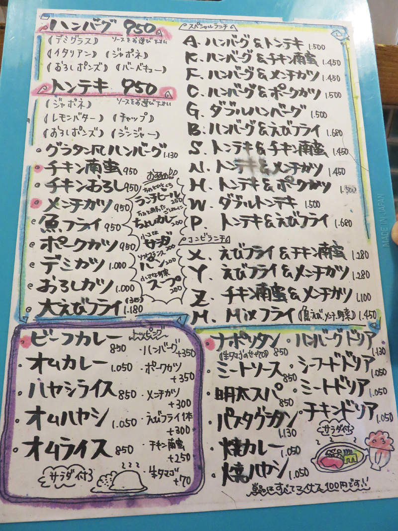 ハンバーグ・トンテキ・チキン南蛮・メンチカツ・ビーフカレー・ナポリタン。