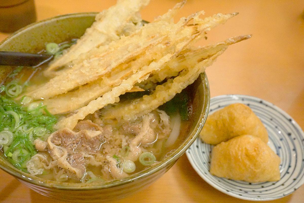 味、食感が違う三種類のごぼう天に、甘辛く煮た肉をトッピングしたうどんだそうです。