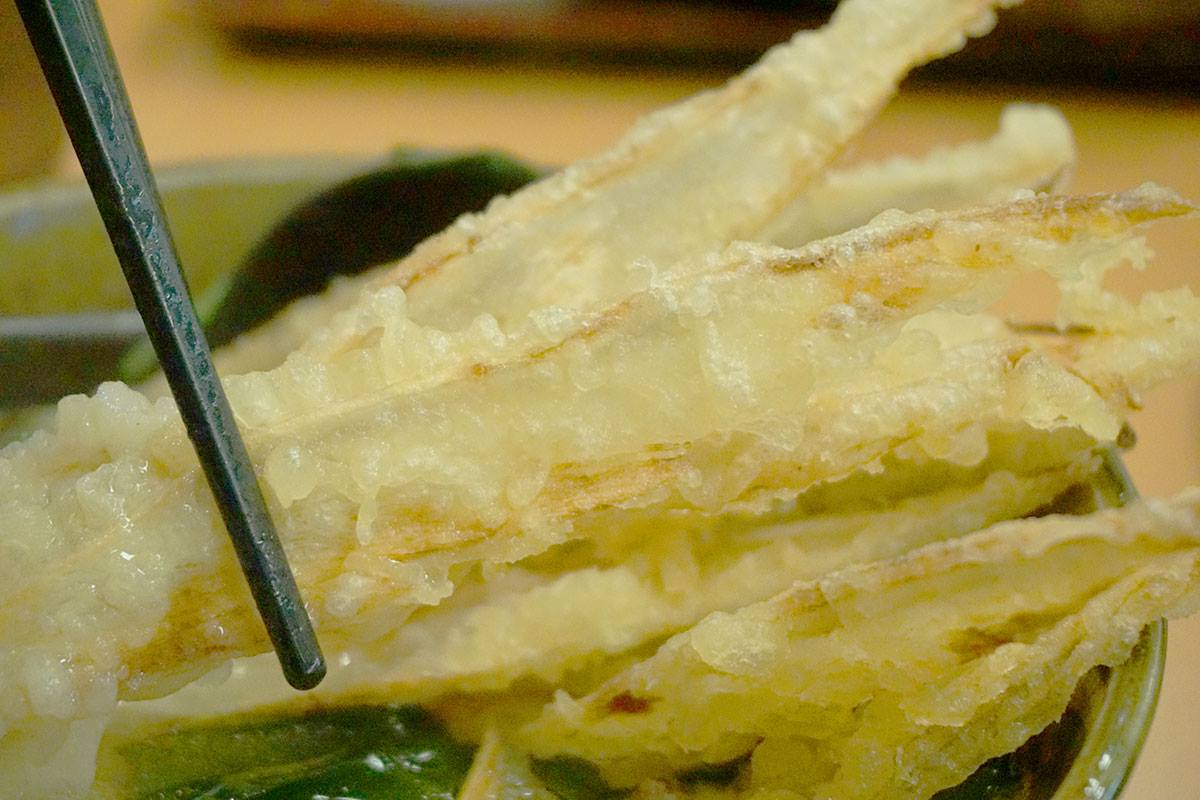 ごぼ天は、豊前裏打会特有のでっかいUFO型の天ぷらではなく、スキーボード型。