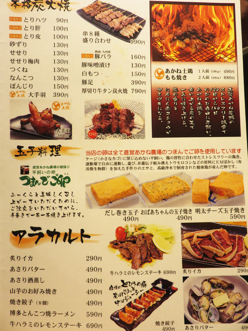 焼鳥・宮崎風鶏炭火焼き・イカや活魚の活造り・水炊き・もつ鍋・屋台風焼きラーメンと