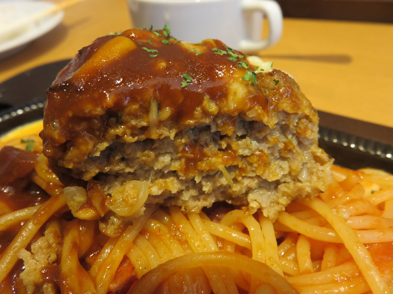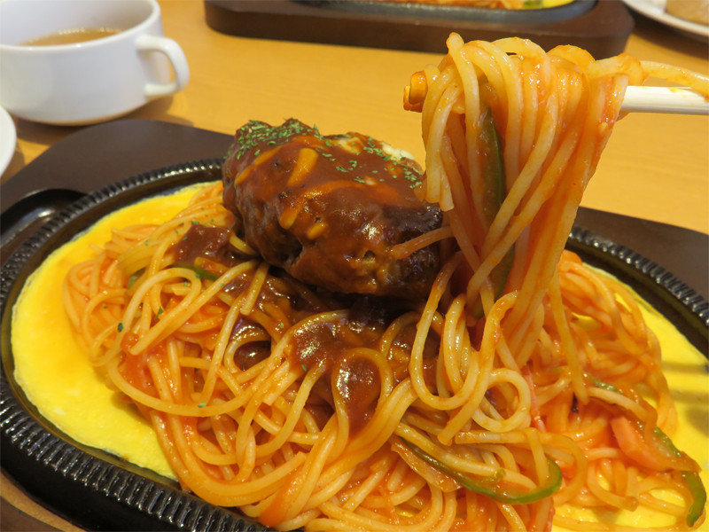 鉄板ナポリタン・ハンバーグのせ(スープ・ライス or パン付き) 1,300円。