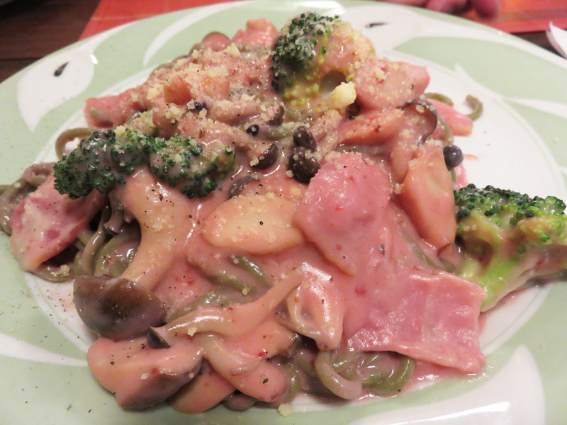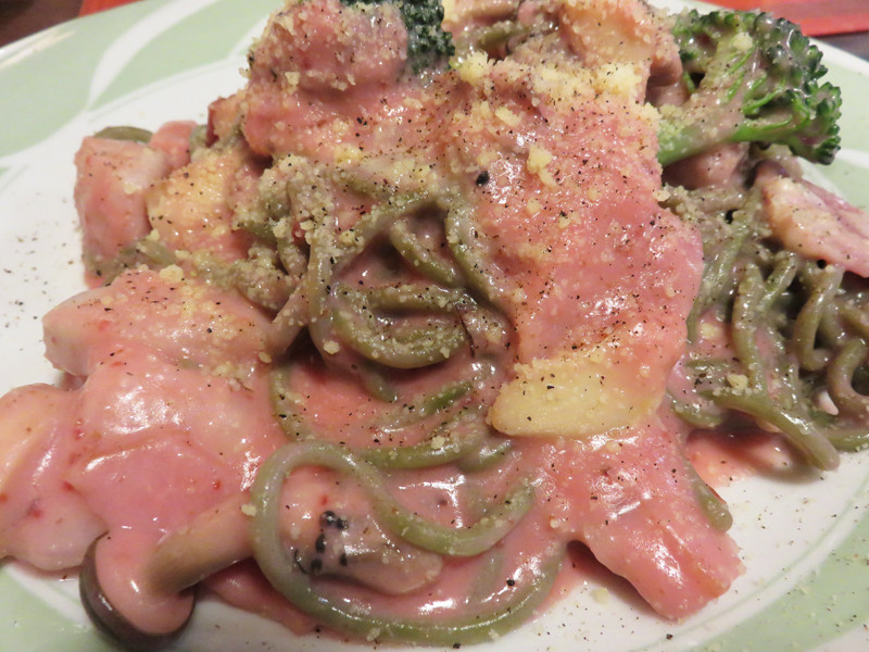 ベーコン・木の子・豆乳のピンククリームパスタ 950円。