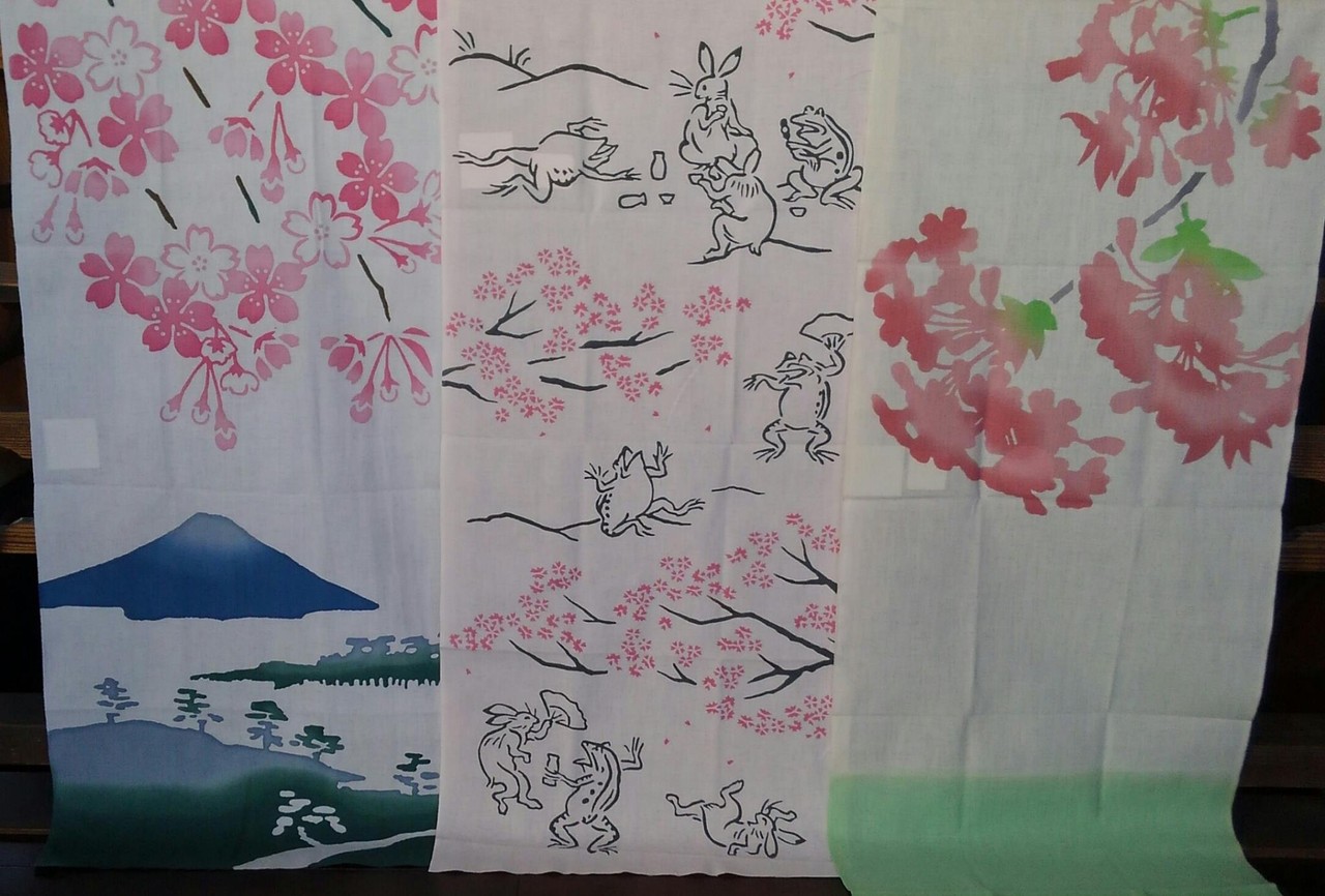 桜など春をモチーフにしたデザインの手ぬぐい約100点を展示販売しています。