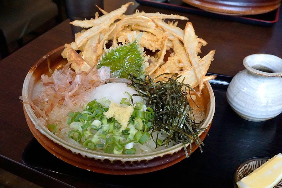 津田流豊前裏打会系のうどんと言えば、投げれば飛んで行きそうなゴボ天が有名です。