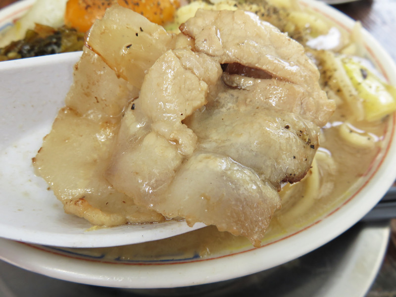 スープは、ラーメン用豚骨スープまんまかと思いきや、ややあっさりしてました。