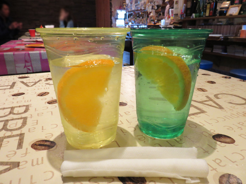 オレンジが入ったお冷と温かい紙おしぼりが出てきました。