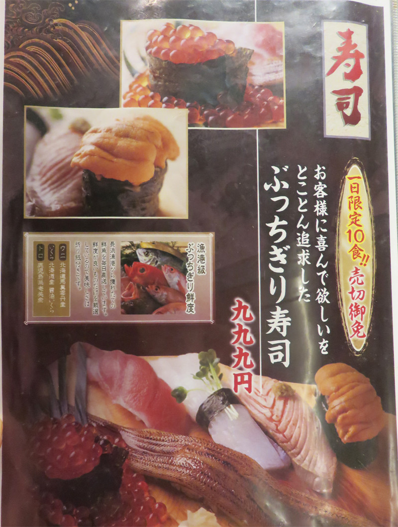 更に、お店名物のぶっちぎり寿司を注文するか迷いましたが、今回はやめました。