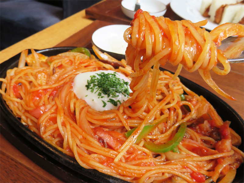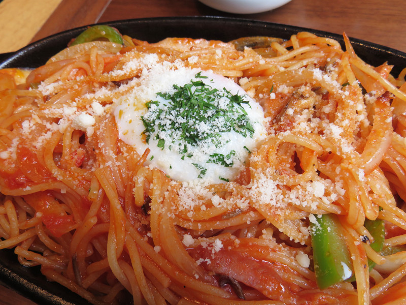 鉄板皿で供され、真ん中に玉子が落とされた超テッパンのナポリタン!