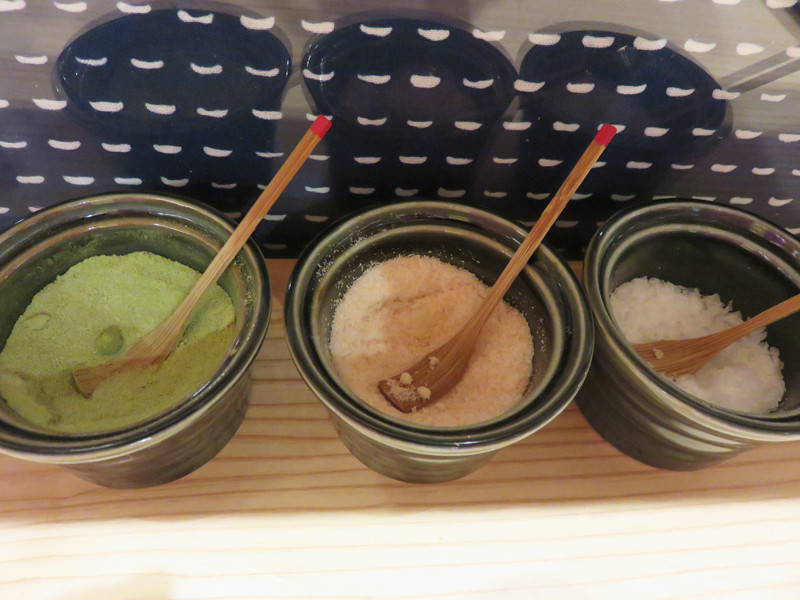 天ぷら用の塩は、卓上に3種類(抹茶塩・ピンクのヒマラヤ岩塩・結晶塩)があり、