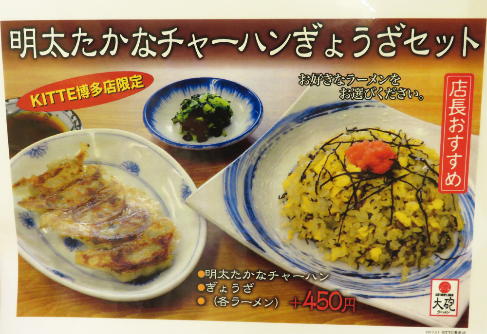 県外の人が集まる博多駅だけに、博多っぽい『明太高菜入りチャーハンと餃子のセット』もあります。