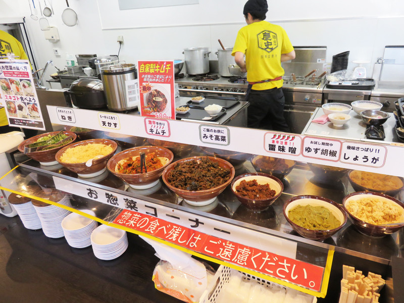 カウンター上に並べられている麺やご飯用の薬味や漬物は取り放題です。