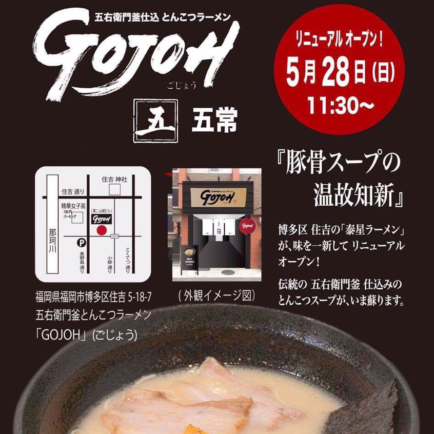 【店名】 五右衛門釜仕込み とんこつラーメン GOJOH(ゴジョー・五常) ※旧:泰星ラーメン 公式HP 公式FB