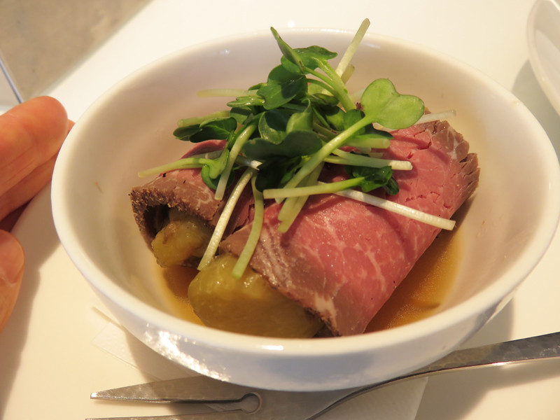 『赤牛モモ肉のローストビーフ 焼き茄子の冷製仕立て』。