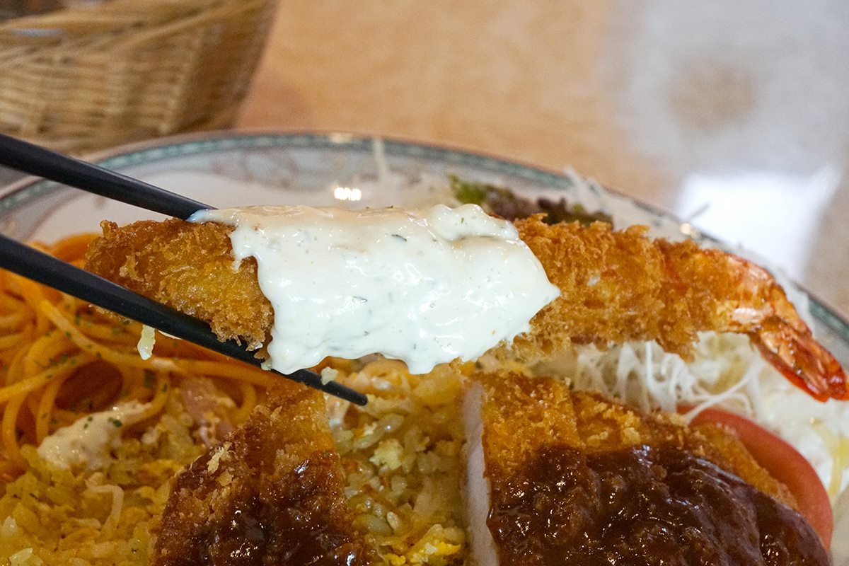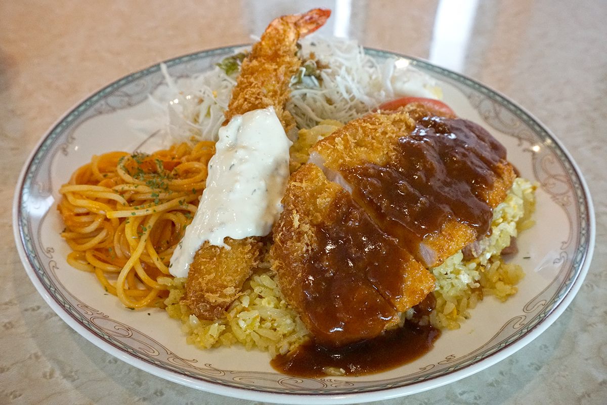 ロースカツ・エビフライ・ナポリタン・ピラフ・サラダ、お約束のてんこ盛りプレートです。