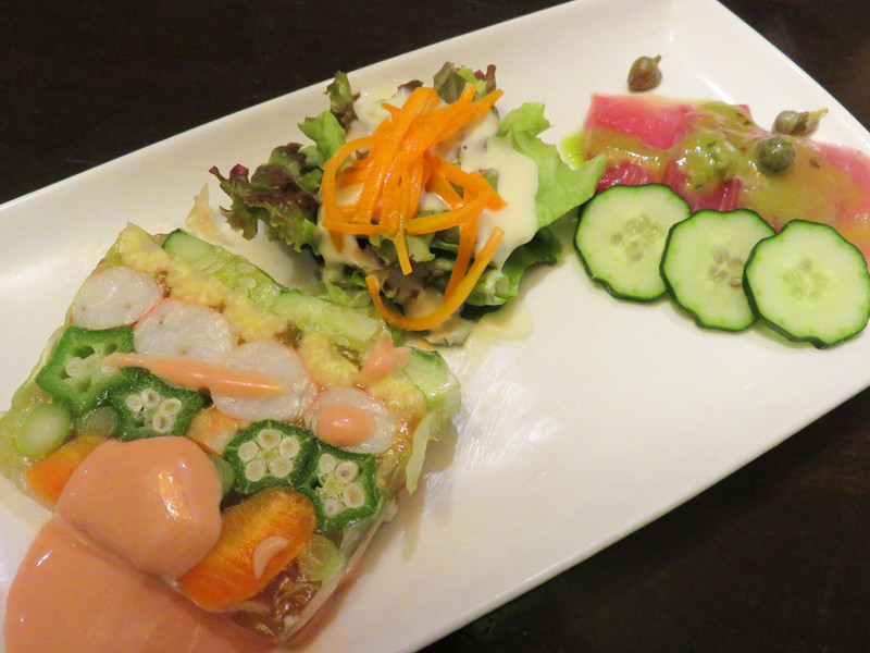 銘々盛りで、夏野菜と海老のテリーヌ・サラダ・マグロのカルパッチョ。