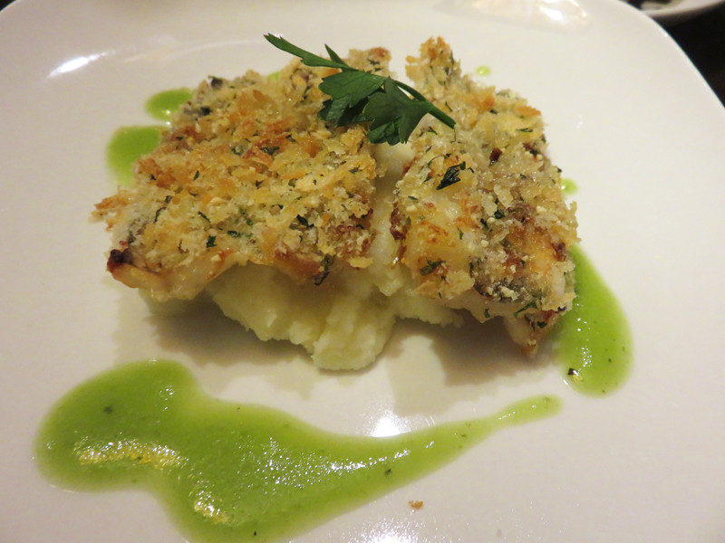 穴子の香草パン粉焼き、マッシュポテトとバジルソース添え。