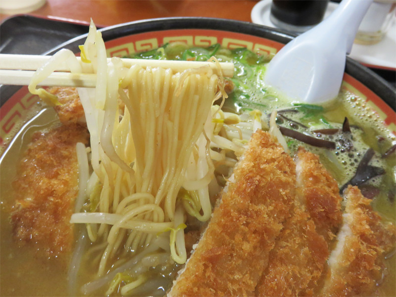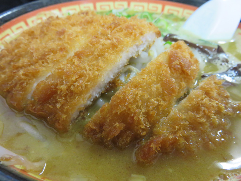 豚骨ラーメンにトンカツが載ったメニューは珍しいです。
