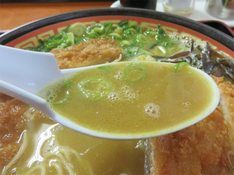 ベースのあっさりサラサラ豚骨スープにカレー粉を溶かし込んだ風味とザラ感。