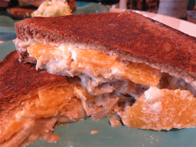 ライ麦入りの黒パン・牛肉・玉葱・ブルーチーズ・スライスオレンジという異色の組み合わせ。