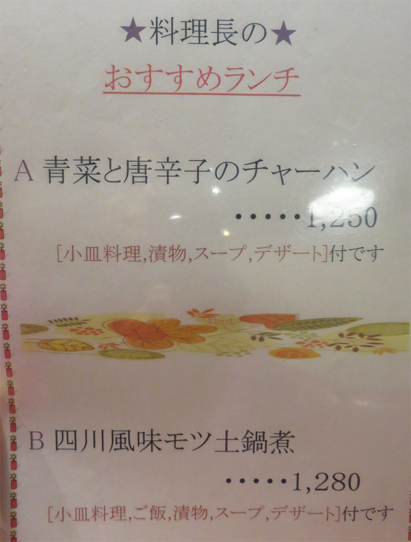 別紙の『四川風味モツ土鍋煮』というメニューに惹かれ、あっさりチェンジ。