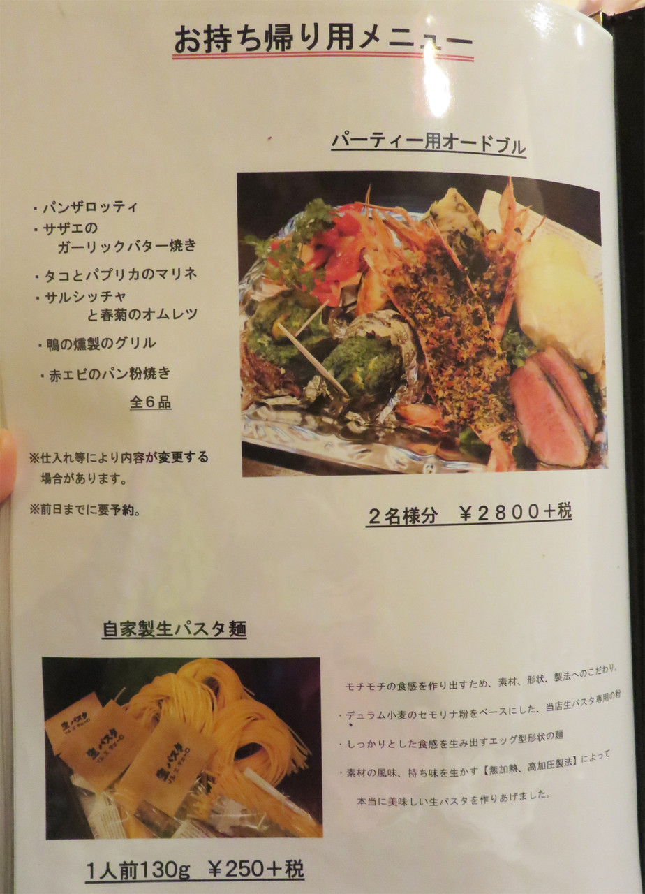 テイクアウト用のオードブル盛り合わせや生パスタ麺もあります。