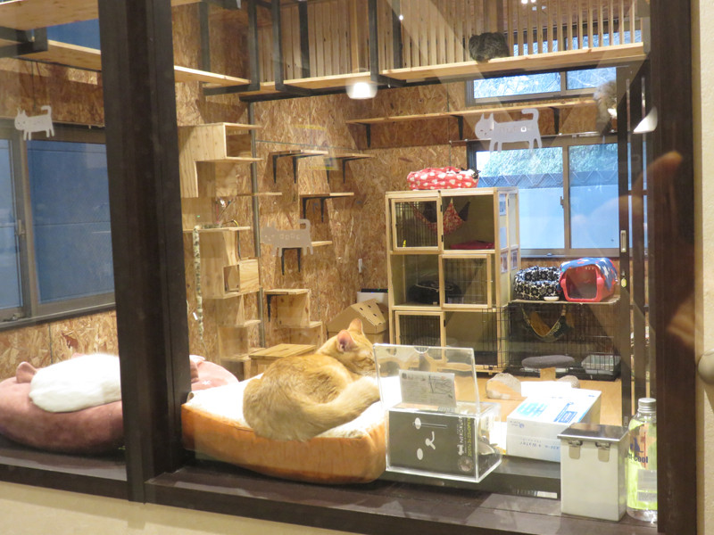 お店の奥は、ガラス張りの猫シェルターになっています。