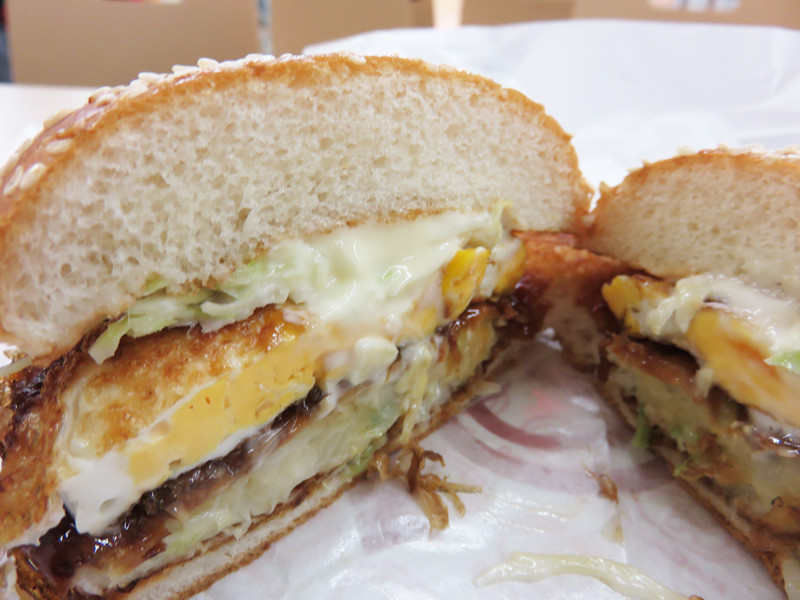 挟まれているのはお肉のパテではなく、キャベツ入りのお好み焼きと目玉焼きと千切りキャベツです。